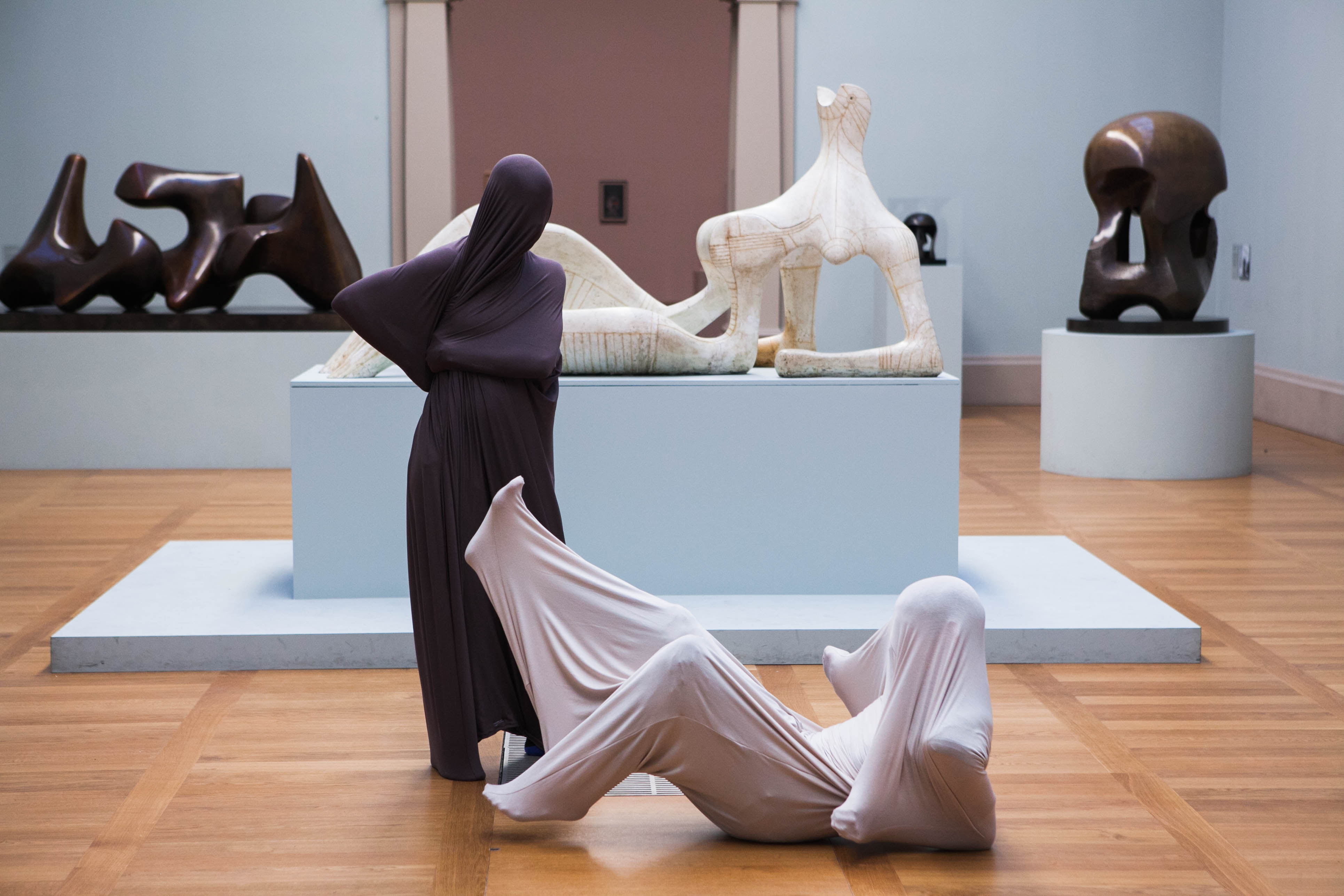 I’ve always loved Henry Moore’s work, it is abstract yet so expressive and communicates with our feelings beyond the level of language. I feel that my work operates in the similar way through the body. When I was offered to make ‘audience participatory interactive work’ for Tate family festival, I sat in the room filled with Henry Moore’s sculptures for a couple of hours, I got the image in my head and I knew it would visually work. The key was how to facilitate the public to immerse themselves in the whole experience and perceive the cohesion of the stillness (Moore’s work) and movement (my work) in the space.